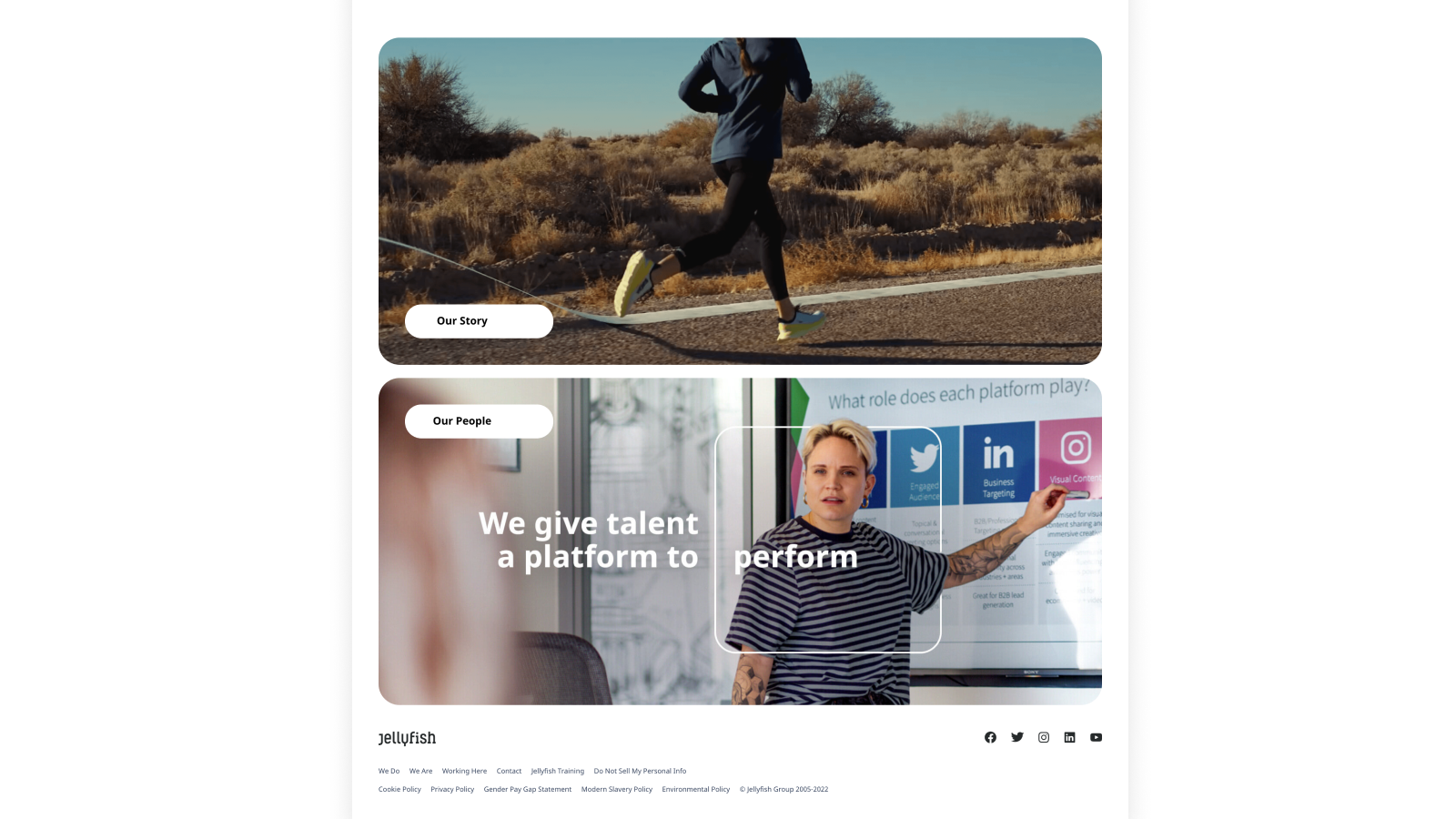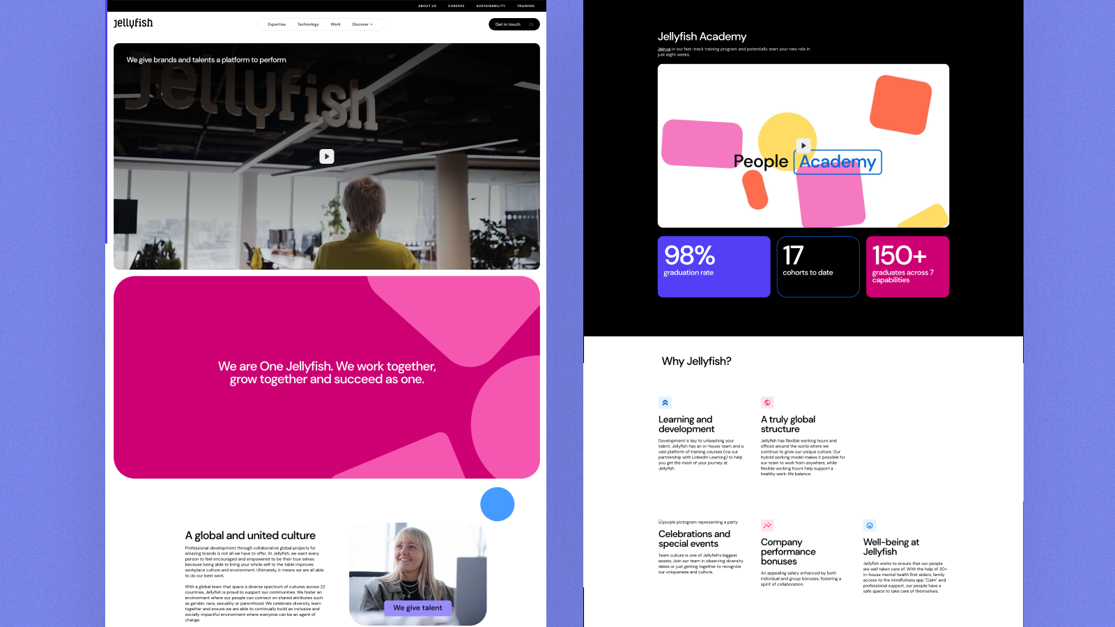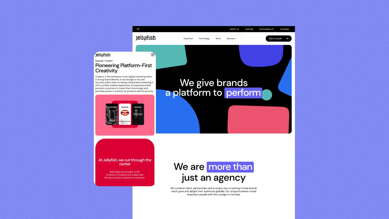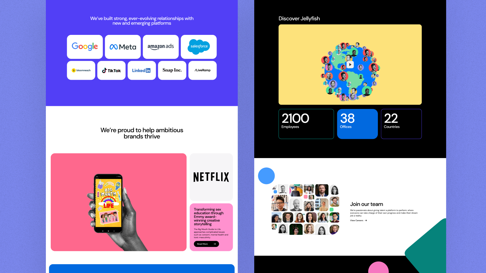 With clearer navigation, user flow, and intentional curated content, the redesigned platform became a multi-channel engine. The new and improved Jellyfish.com supported thought leadership, campaign landing pages, performance initiatives, and capability storytelling within one scalable system. Governance and workflows ensured cross-team consistency at global scale.